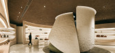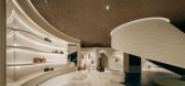 入口斜墙对内形成休闲及展示区,可展示香氛,艺术品等。镜面反射出天花朦胧光感的多面奇幻空间,如多维度空间下的平行世界,游走于意识结构内发生的梦境与现实的空间。
