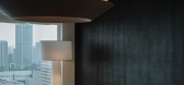 主卧在电梯出来右手边,卧室门采用黑色极窄边框的形式,并且做了加...