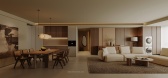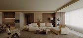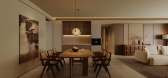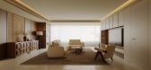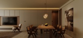 本案的客餐厅空间中心位置,横亘一支离地高度 227 公分的主结构梁,梁本身宽 74 公分、高 64 公分,我们将这支大梁,作为天花板设计的最低点-也是起点,由此向两侧延伸向上的天花线条,宛若伸展的羽翼,希望能柔化大梁...