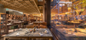 进门右手边安排背衬木质格栅的迎宾柜台,并隔着木饰墙与等高的轻食吧台弧角相邻。而为了彰显设计连贯性,两处量体外观皆由黑铁构件镶嵌大理石打造,借材质与线条相辅相成,营造精致低奢的现代之美。