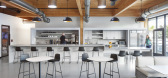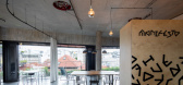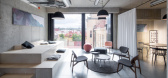 ... outside: a window connects the café with the lobby, while only a pane of glass separates the restaurant area from the café. The yellowish green tint of the glass partition wall alludes to the moment when water and cleaning agents mix. The large lights above the community table pick up on this ass...