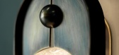 OURANOS I 具有一个单独的有光泽的石英球体,悬浮在一块黄铜板上。