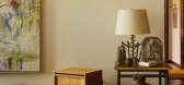 ...dcrafted plaster lamps complemented by bespoke tailored cushions made with custom-designed hand-painted linen fabrics.