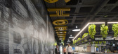 ...hat when repeated, produces a luminous landscape ceiling. The hanging Hams differ in color, graphics and display messages such as: Moritz, Barcelona’s Best Beer, Take Away, Fast food.