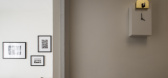 ,在洗衣房里,条纹的墙壁被漆成...
