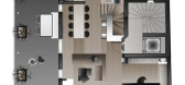 ...ion between the dining room and the living room. The visual junction was established through the dining room table and the flooring helps to delimit the spaces.