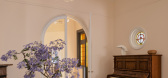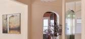 ...fireplace as a focal point. A wooden coffee table offers a gathering spot, while wall art and vibrant plants, along with open shelving, enhance the space.The kitchen boasts soft neutral tone and classic cabinetry with glass-front sections for ample storage. Large windows bring in natural light, addi...