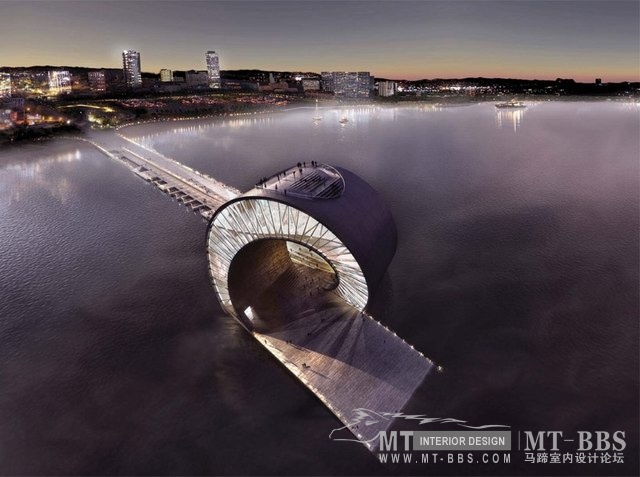 方案将城市整体规划的路网在码头汇集,码头最终消失在坦帕湾(Tampa Bay)的海水中,在码头即将消失的地方,地面卷起,犹如一个巨大的海浪,卷起翻滚180°后再次汇入水中,形成的空间与建筑作为“Tributary Park”(支流公园),区域内种植多种本土植物,通过各种色彩搭配点缀在景区内。公园还包括博物馆,观景台,游乐场以及自然花园等功能供市民游览参观。“海浪”建筑的下面广场可作为露天市场,音乐会场地以及举办室外展览的场地。