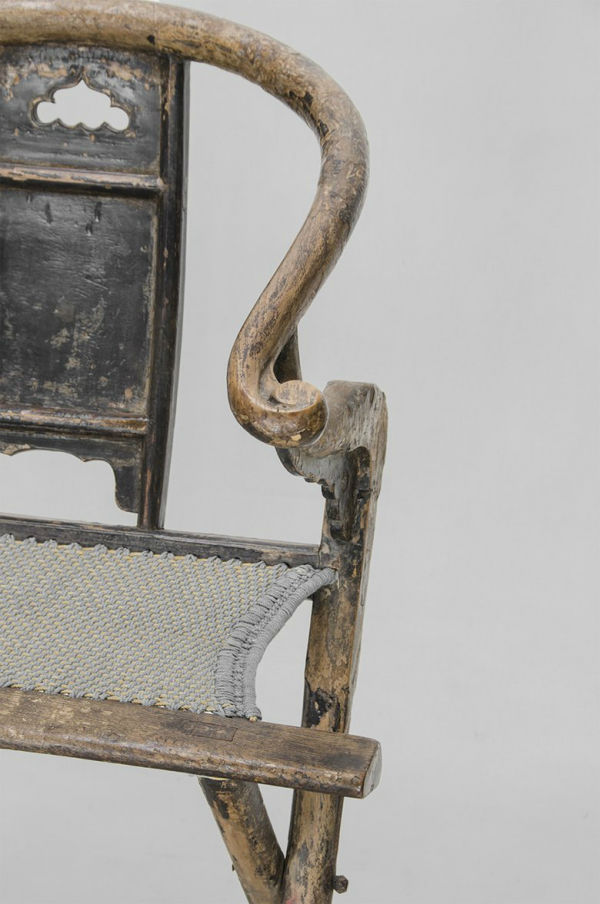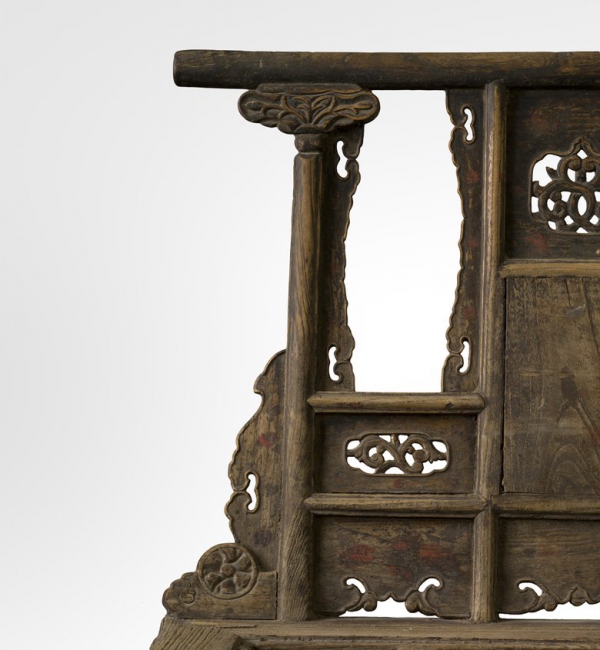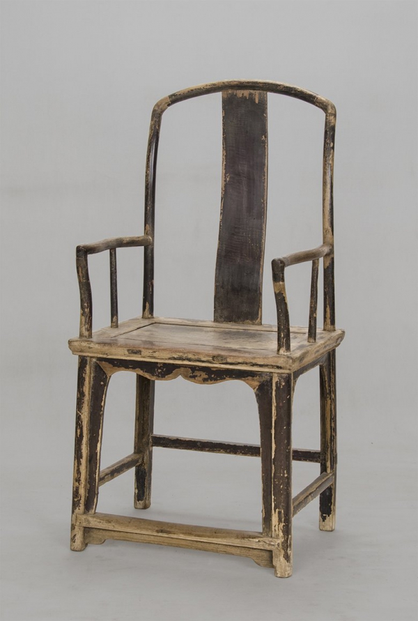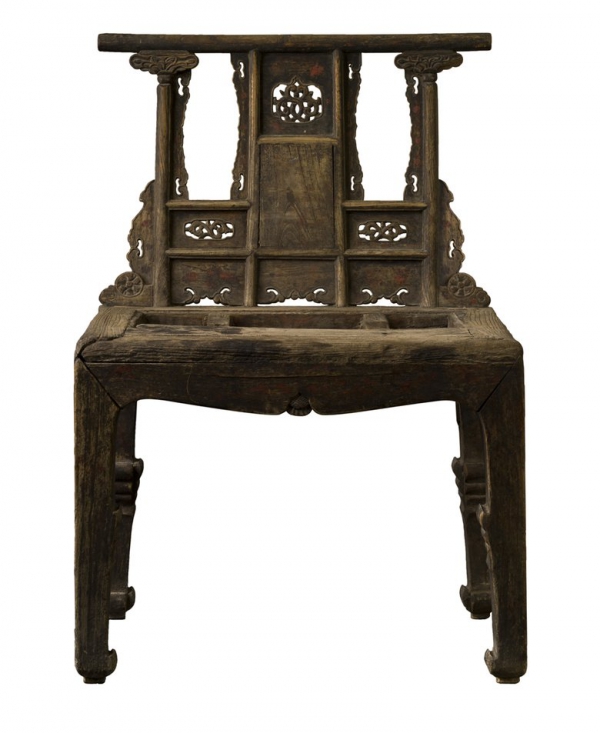 整器淳朴凝重、古风扑面,细细观察,尚可于靠背、座面下牙板等处,发现残留的漆灰痕迹,上面描金红色花卉纹样依稀可见,显然该椅当初为黑漆彩绘之作。其漆层与灰层均较薄,源于靠背结构复杂、雕饰精细。薄漆薄灰既对器物起到了保护与装饰作用,又可使细节得以充分体现,故常施于雕琢精细的器物之上。