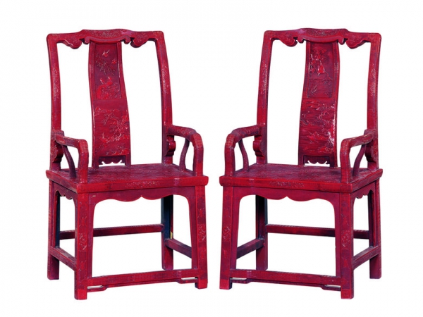 明晚期 长61厘米、宽50厘米、高113厘米 靠背板上做文章,上部镂空“福”字,中间嵌长方瘿木,下部镂空如意云头,工艺独特,整体大气。 黄花梨双龙纹交椅 明晚期 长63厘米、宽45厘米、高101厘米 前身胡床,宋代定型,用料讲究,靠背板雕如意云头,椅身雕双龙纹,多处使用白铜件,使之坚固。 剔红花鸟纹南官帽椅 清中期 长61厘米、宽48厘米、高113厘米 通体剔红,靠背及座面均饰花鸟,富丽精致,观赏大于实用,古人生活奢华,此为例证。