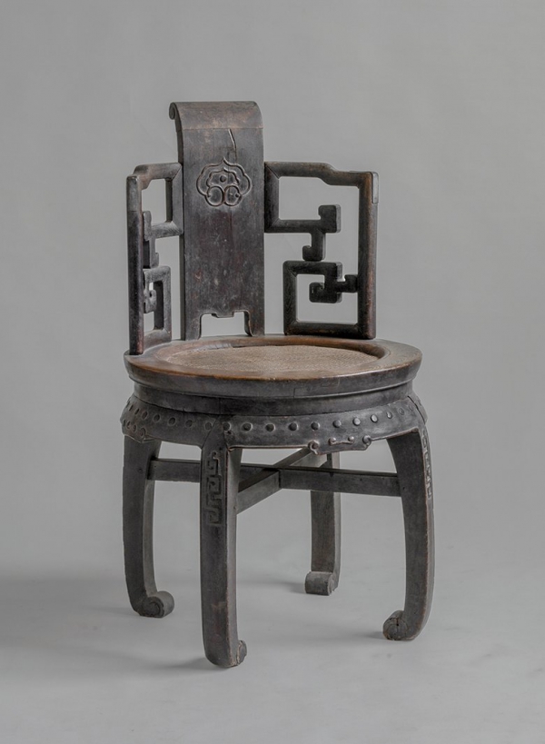 传世的明代交椅罕见,尤其圈背的样式;此把扶手流畅而卷头自然。攒框的靠背如意开光与亮脚充满与简洁。下面的铁铰钉,脚踏,与托尼都有难得的元配状态。整体的形貌有明代贵族的气势。 清代早中期南官帽椅 产于华北,此椅子即南官帽椅的样式,又有清雅文气的容貌。高狭窄之靠背与大弧形塔脑有温柔高僧的独点。 清代中晚期榉木圆椅
