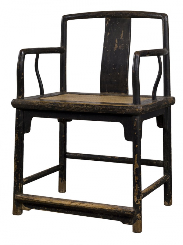 通体批灰、髹黑大漆,除在腿、枨处有少许漆皮伤损外,其余部位均保存完好。其漆质上乘,色泽古雅沉穆,且得数百年造化,断纹满布,梅花断、牛毛断等纹络纵横。此椅出自晋南地区,明味十足,造型与工艺不让同时期的黄花梨制器。