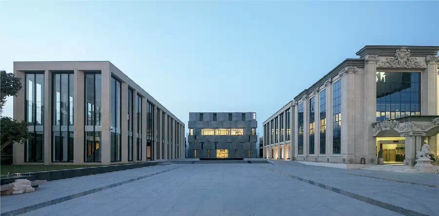 雕刻馆座北面南,处于广场中轴位置;东西两侧分别是保留下来的原有办公楼和新建的接待中心。它们与艺术馆形成U字型广场,环抱中间水池。长方形广场面宽27米,进深达56米,纵深感极强;建筑与广场之间的尺度关系,以及中轴布局的方式更突显出了雕刻馆的庄重和大器。广场周围的三栋建筑各自不同,我希望新旧建筑之间有着某种你中有我,我中有你的不可分割的联系。东侧必须保留的原有办公楼是黄锈石材质欧式立面建筑,它见证了鼎立企业的发展历史;西侧新建的接待中心也采用同样色彩的仿石涂料与之相呼应,但是同样强调纵向感的立面却更加开放透明,极富现代气息,是新面貌的体现。接待中心也采用了立面柱突出的形式,在比例上与原办公楼的欧式柱式相似,但是不同方向切角的柱截面形式使得每根柱看上去都不一样,在光影下使简洁统一的建筑富有变化和动感。东西两侧黄锈 石材建筑反衬出了中轴线上深灰石材的雕刻艺术馆,使其更显厚重有力。