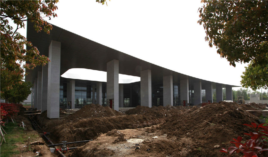 华信塑业集团是江苏新沂市最重要的企业之一,也是我国第二代身份证件制作用材的专用供应商。2013年我设计了华信接待中心,现在已快竣工了。在此项目设计中,业主的要求是建一栋现代的、大器的接待中心。由于当地厂区没有任何可以参考挖掘之处,因此业主的要求最终必须通过建筑的形式操作来完成。