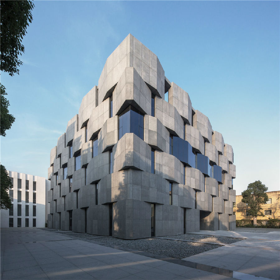最终的立面材料并没有采用什么名贵石材,而是当地易采的普通花岗岩,崇武人称它为“G654#”,经常被用作石雕的用材。当地古城中的传统石房子历来就地取材,用石块垒叠砌筑而成,独具特色。雕刻馆立面巨石垒叠的设计概念不禁让人与崇武当地的“出砖入石”建筑传统联系起来。而简洁纯粹的垒叠形象极富现代感,抽象地表达了建筑与当地人文历史的联系。西方传统石砌建筑立面线脚突起的精妙之处在于控制墙面的阴影,各突起因为程度不同而造成微妙的阴影比例关系,刻画出生动的建筑立面。巨石单元之所以呈折面形式,固然是为了取得建筑表皮形式感,而更重要的是控制表皮单元受光面、背光面以及阴影的变化,为建筑立面增添生动趣味。由于一天内日光角度变化,巨石的受光面、背光面以及阴影都在不断地运动中,显得丰采多姿。在建筑转角处,折面巨石会在一三五层转角处生成锐角形式,与整个建筑厚重的气质很不协调。在保持石材磊叠关系不变的基础上将锐角转角处作800mm宽切角面的处理,呈现出一种拙钝的视觉感受,很好地维护了建筑整体感。