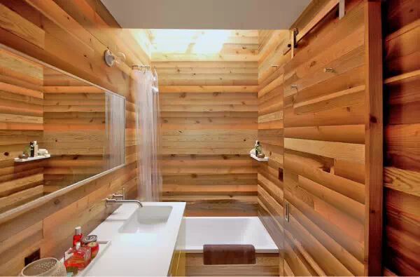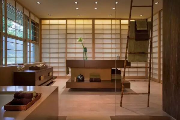 墙壁、门、屏风、空间里的边框大多是由实木做成。最常见的一些木材是枫树、柏树、铁杉和红松树。竹子是一种非常受欢迎的装饰材料,在上面这个浴室里,竹梯就是一个很好的表现。