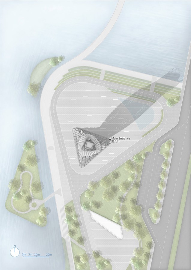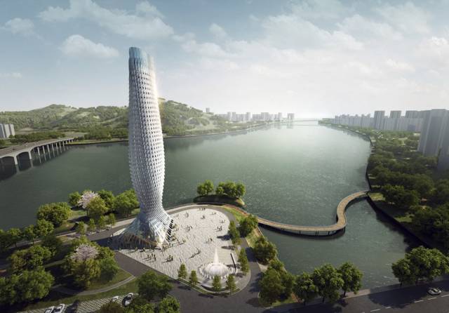 景观塔的设计灵感来自于斗门特有的水文化,以跃鱼的姿态象征斗门的富饶和蓬勃发展的前景。同时,景观塔采取中轴对称的设计手法,满足多角度和全方位的观赏需求。