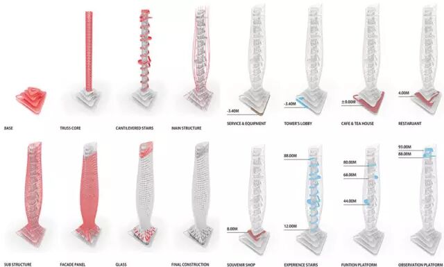 除了乘坐观光电梯直通塔顶,本方案还提供80多米高的徒步登塔路径,并在其中插入空间互动平台供游客登塔中休憩。顶层观光层采取双层观景平台设计,在88米层设环绕玻璃墙,有效减少强风对观光的干扰。另设93米开放式观光设计,黄杨河岸美景一览无余。