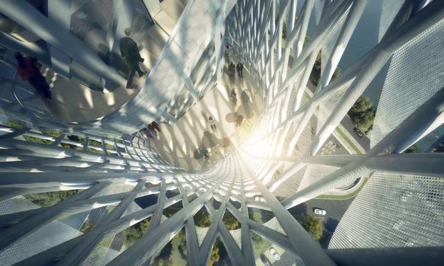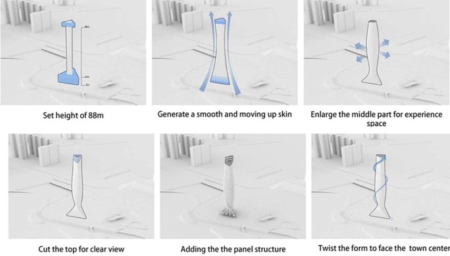 塔身中部膨胀,释放更多的内部活动空间,塔身整体扭曲,为塔顶获取最佳的景观朝向,此方案在景观塔原型的基础上,膨胀、扭曲形成一种自然的仿生形态。