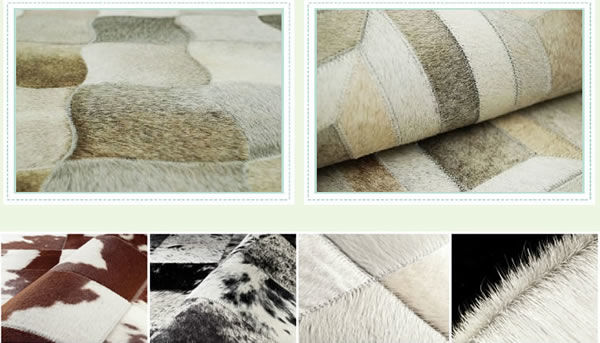 牛皮地毯的牛皮毛被稀疏,胶原纤维编织较为疏松,因此具有很强的透气、透水性能,触感亲肤。另外,比起其它动物皮革,牛皮张幅较大,每张可达3—5m2,干皮重在7.5—18 kg,厚度为9~10 I砌,适合制作张幅较大、质感卓越的优质地毯。