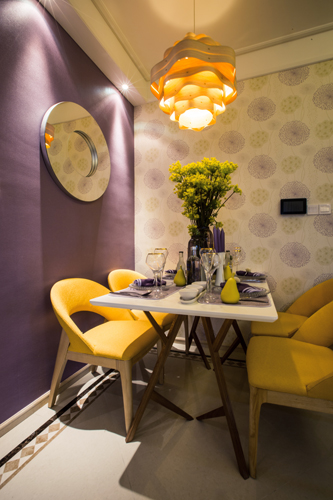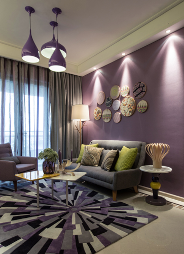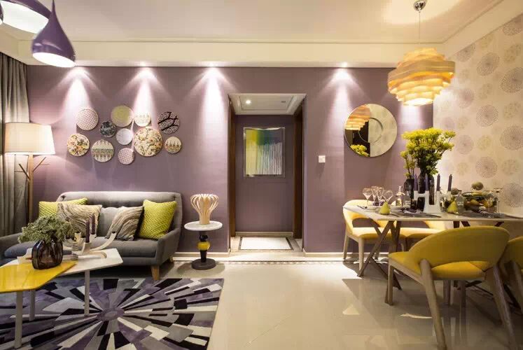 黄色和紫色是一对明暗对比强烈的组合,是补色中最突出的一对。他们的结合如普罗旺斯的阳光,浪漫而灿烂。将黄、紫这两个对比色放在一个空间。以灰紫色打底使黄色更为突出,空间变得丰富。