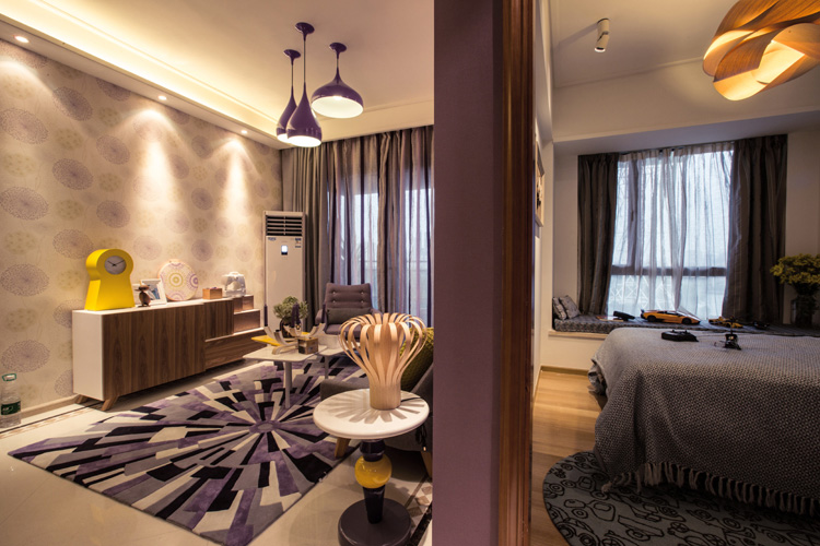 儿时,我们总在童年的万花筒里,窥视色彩的秘密。家是可以多彩的,多彩的颜色能为家带来焕然一新的变化。黄色作为颜色中最明亮的色彩,它以最绚丽的姿态绽放在这个世界上。从T 台秀上的流行服饰,到如今的家居饰品。它重新赋于这些家居品鲜活的生命力,并让它们成为了一种潮流。黄色象征着阳光,将一缕缕温暖的光线带到室内,它象征着希望,是阳性色彩的代表。紫色代表着女性的颜色,沉稳且优雅,多用则会显得空间沉闷,黄色的出现则为沉稳的空间注射了活力,独特的撞色创意是十分讨巧的方式。一冷一暖、一阴一阳交替的碰撞,使空间充满创意而不失温馨之感。沉稳的灰紫色和明艳的黄色搭配变得富有情调,并相互融合营造强烈的视觉效果。将室内设计带来无线光泽度的美感,在本案熠熠生辉。