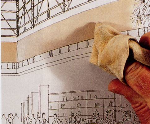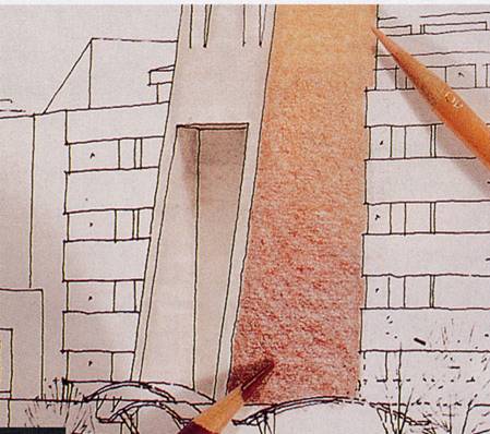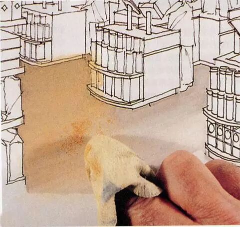 2、两者可以产生调色作用,注意在右边曲面招牌上,在土黄色马克笔背景上使用了白色蜡笔