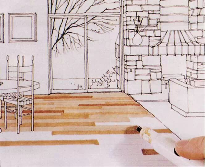 先用铅笔绘制辅助线,用不同颜色的马克笔穿插绘制地板底色