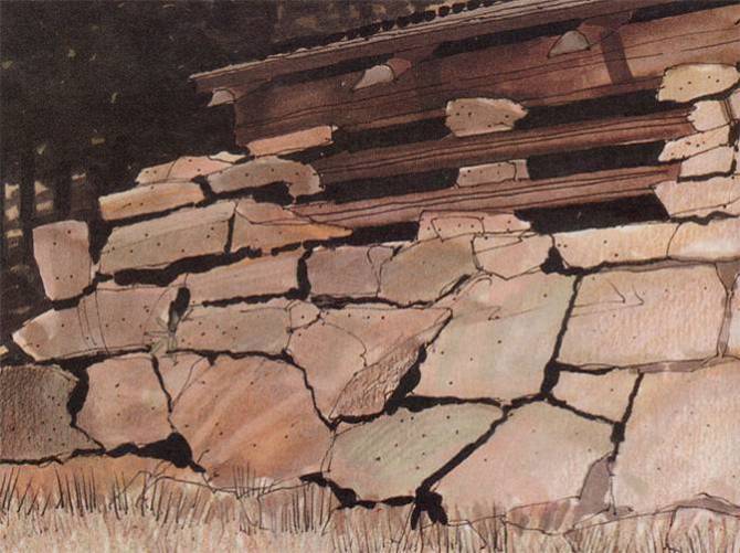 下面是短时间内完成的一张效果图,用几种颜色在马克笔底色上绘制石块细节信息,最后用黑色马克在石缝中加入阴影,就完成了