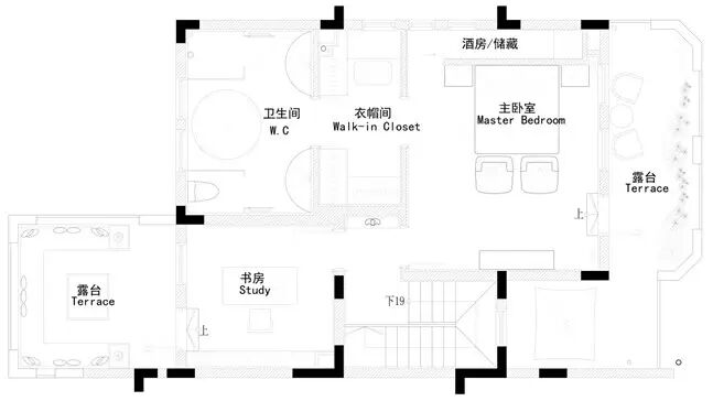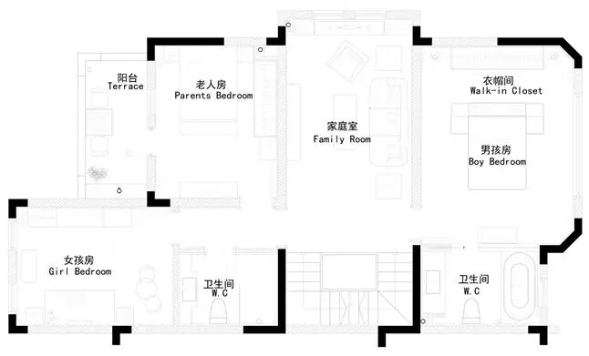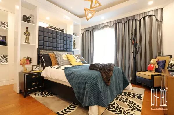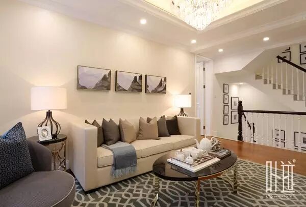 二、三层为私属卧室区域。家庭厅是这里唯一的公共空间,连接各个卧室成为整个二层的核心,颜色上以灰蓝色为主,小面积金色及金属材质的运用打破空间的沉闷,增强奢华感与节奏感。五色酒、英式茶具、挂画等软装饰,彰显温馨生活氛围的同时体现了贵族惬意的生活方式。