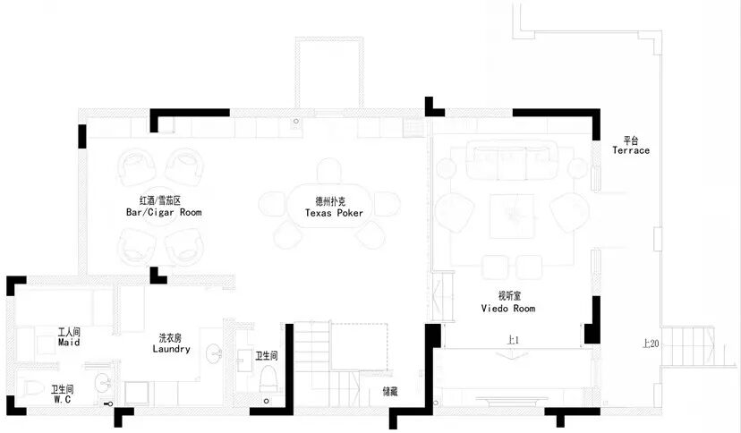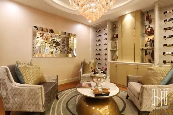 别墅的地下一层,设定为休闲娱乐区,兼具品酒雪茄吧、牌室、影音等功能,在保留空间私密性的同时又不失动感;色调上以灰色系为主,融入蓝色、金色、紫色等色彩营造奢靡不失清爽的尊贵。另一侧下沉式影音室,作为家庭间亲子互动的温馨平台,抽象却饱含情绪化元素的装饰画仿佛电影中定格的画面,让空间萦绕温馨时尚的观影氛围。