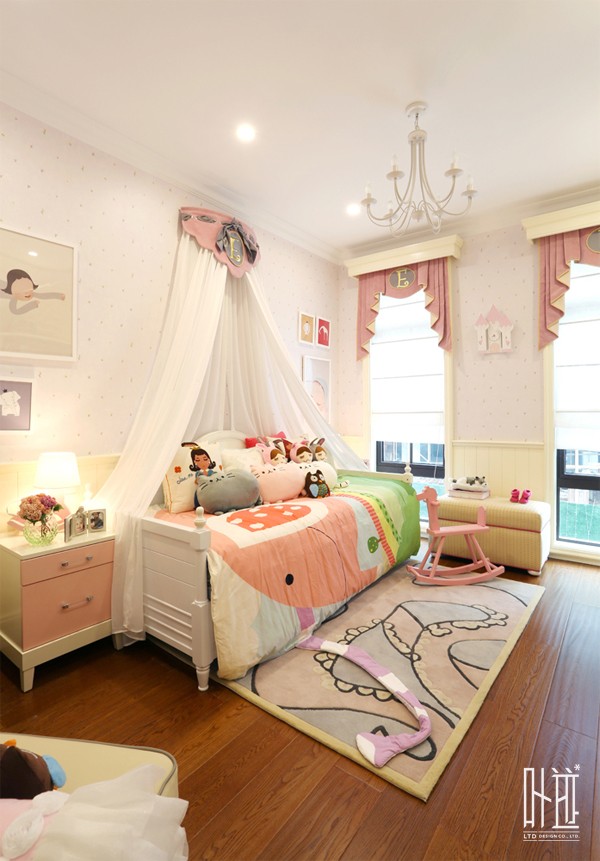 男孩房在色彩上承接家庭厅的蓝色调,橙黄色的撞色对比及运动元素的融入塑造了小主人鲜明的性格特征。婴儿房中,则将温馨、柔软的特质进行诠释:粉嫩色系的运用多而不乱,整体和谐又富有变化。量化阵列的公主芭比、毛绒Jellycat Bunny的玩具彰显小公主尊贵娇宠的特殊身份,而家具的摆放也充分考虑到了充足安全的亲子玩乐空间。