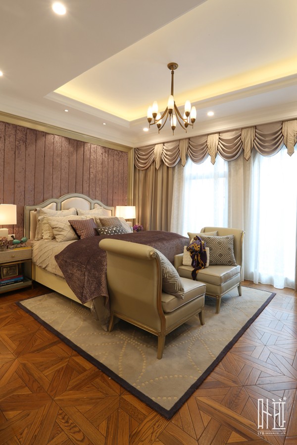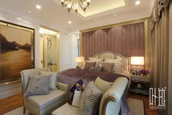 三层的主卧空间又重新回归“普罗旺斯”的主题,在深紫、灰紫、玫紫色中融入了小面积的灰白及咖啡色系,床尾沙发的使用,优化了生活动线。开阔的抽象风景油画及镜面的装裱形式再次强调了浅对比间的细节表达。整个主卧洋溢干净、简洁的“低调奢华”。