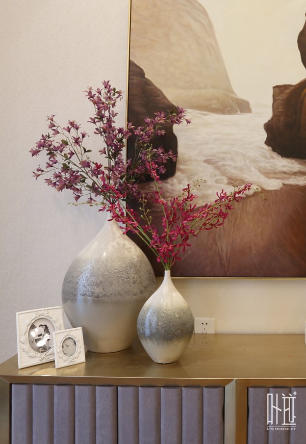 从玄关穿过厨房来到餐厅和客厅,不同层次的紫色调呼应“普罗旺斯”主题的同时,也大胆融入金色和绿色等暖色调。个性时尚的锈镜、奢华璀璨的水晶、冷峻坚硬的金属、温馨柔和的布艺,材质与颜色上的碰撞和对比,不仅为空间带来丰盈的视觉效果也传达剖析了贵族生活的高雅与奢华。