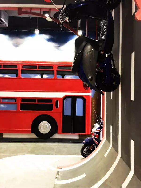 英国特有的红色双层巴士,印有英国国旗的小绵羊机车,结合特色街道设计,展示一个蓝天白云下的英伦街区氛围