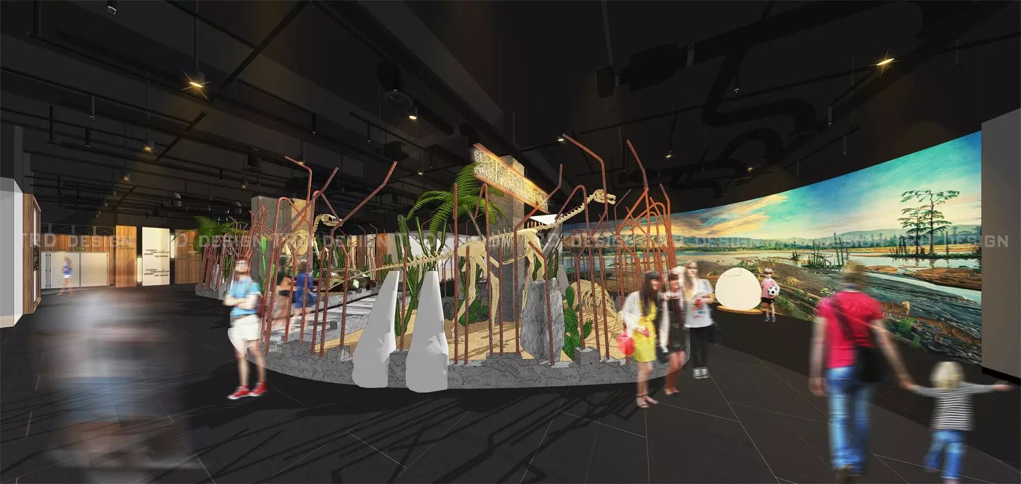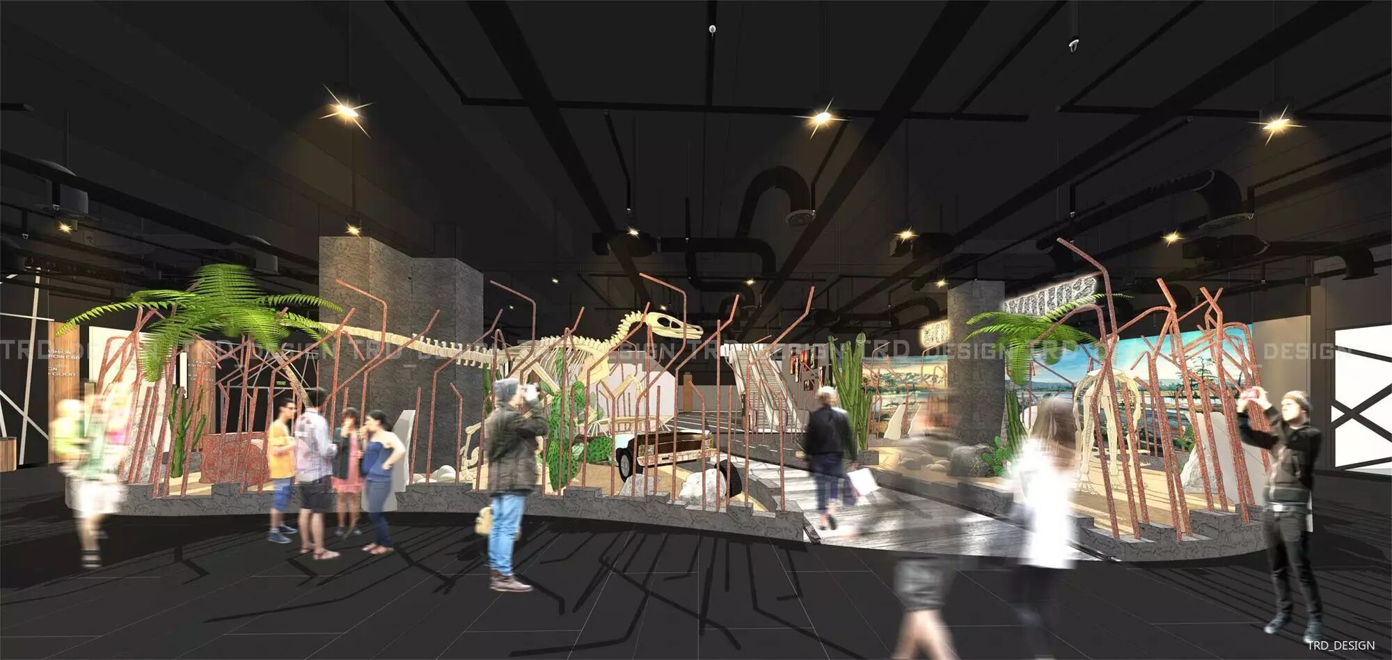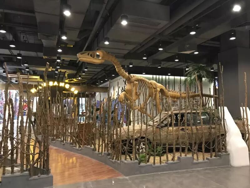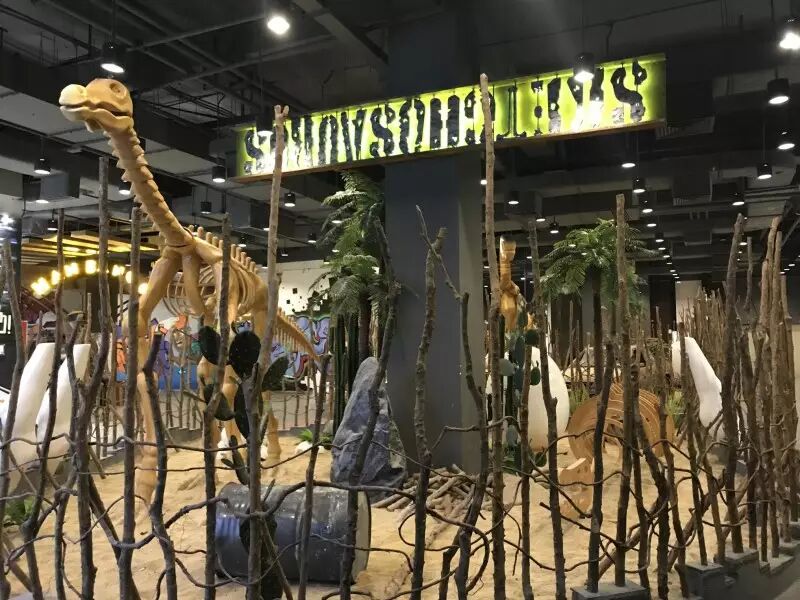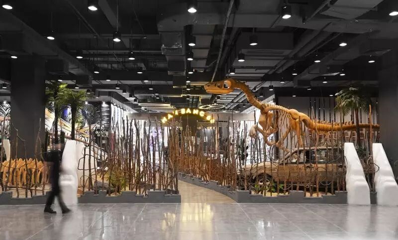 通过美陈布置还原了侏罗纪场景,枯枝围栏、慌旧汽车、恐龙造型、锈蚀油桶等,让整个场景栩栩如生,成为整个商场特色情景街区的重点