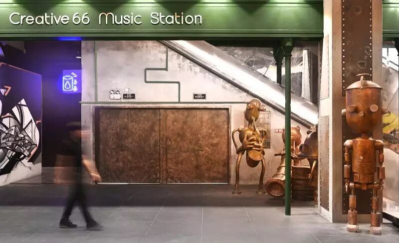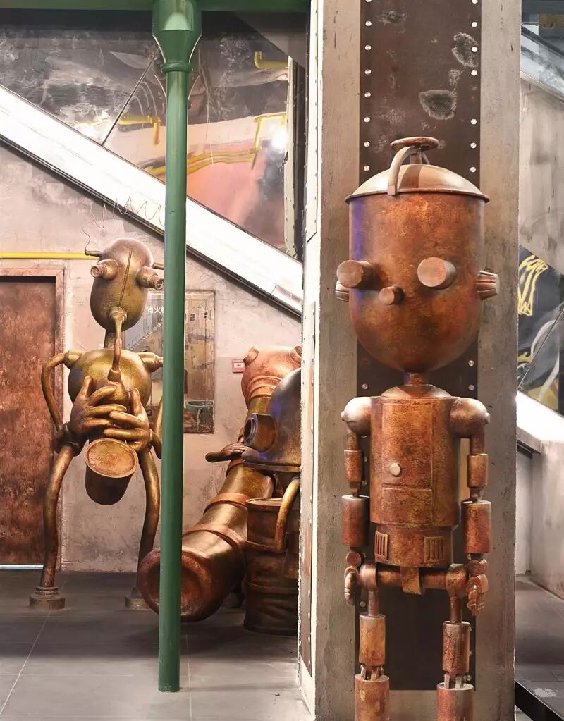 各式机器人造型,采用做旧的锈蚀质感,结合诙谐的音乐元素,展示一个复古俏皮的工业风氛围