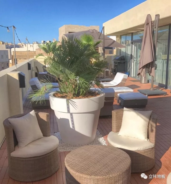 我们这位客户把产品放在了露台,而且是大面积铺装,因为立咔易装地板的特性,对于夏季户外40度的高温简直不在话下。