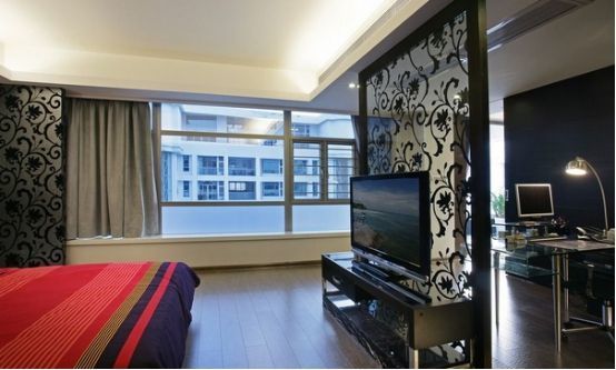 4.这款隔断的设计是非常巧妙的,既没有封死整面墙,还用半透明的设计做了一扇卧室的电视墙,实在是两全齐美呀!