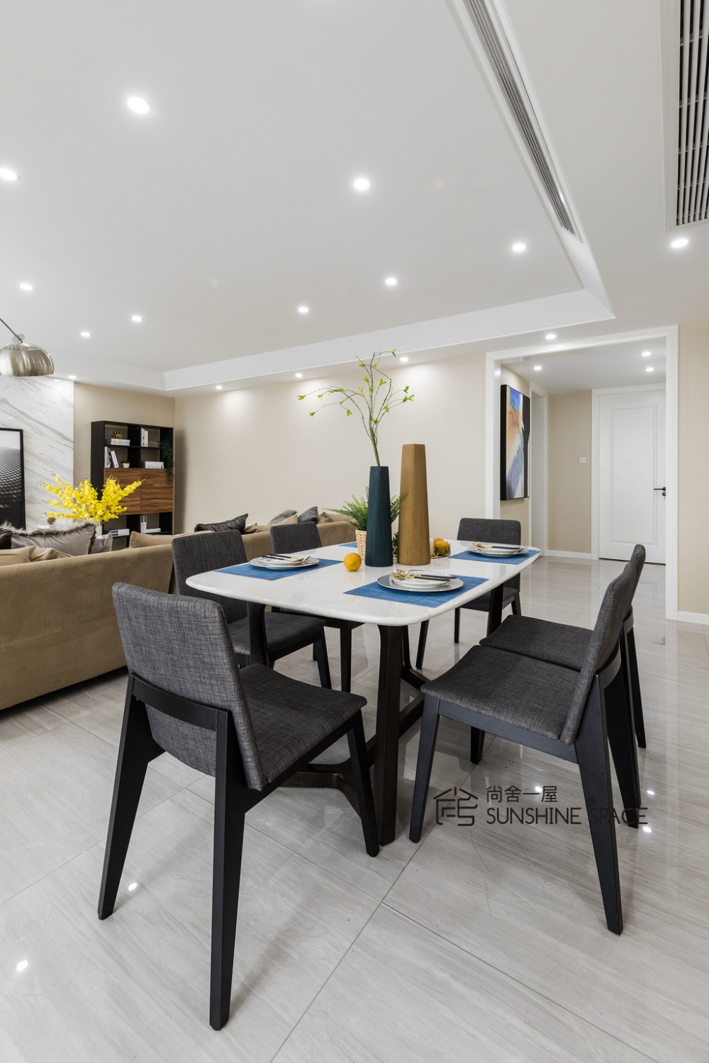 不规则斜线的吊顶设计,强调出区域的独特性和亮点,同时也巧妙的规避了客厅层高过矮的问题,同时在软装上利用冷暖的色调搭配,再次突显层次感。