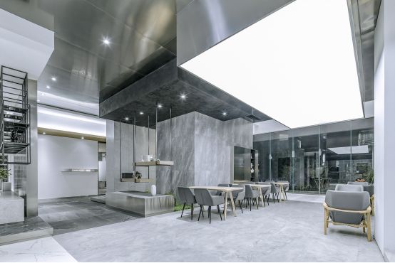/ 二层以产品选材区和设计师交流区为主.而当推门开启,顺着楼梯视觉的延展,形成不被阻隔的开放动线,展示区有犹如画廊展示,欣赏丰富立体空间层次之馆,赏景心情浏览磁砖之美。在建筑外观到一楼内部延伸的中空位置,使得二楼空间还是有着室外的氛围,与强调质量和环境的花园里外相合,在洽谈区品茶道之间,让观者悦心。