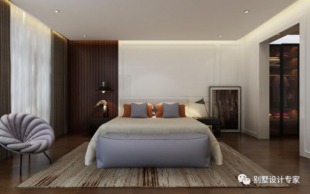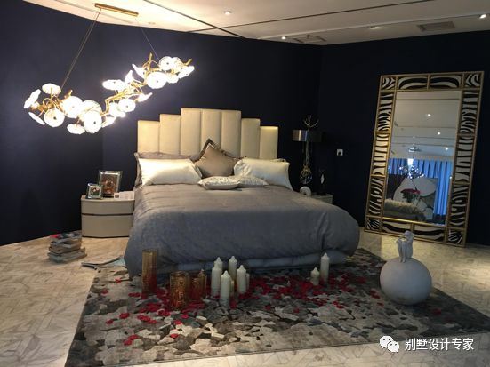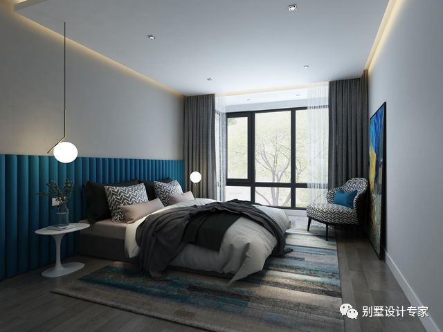 深棕色作为主卧背景装饰,以其深沉及低调展现不凡品味。搭配着同样色调浓郁的蓝调双人床、配以高级灰与造型别致的灯饰加固色调,整个空间低调有礼,贵气十足。