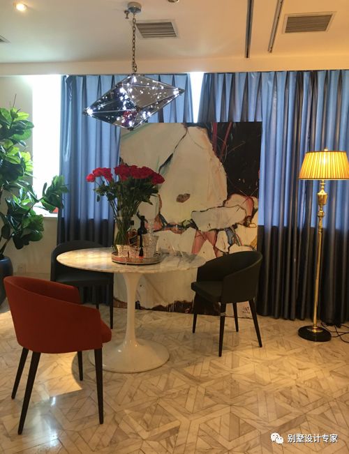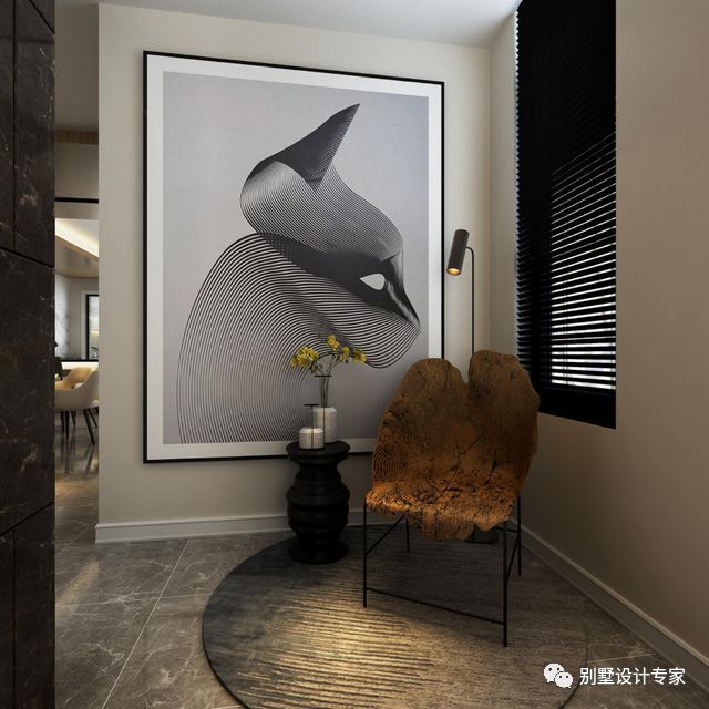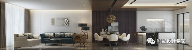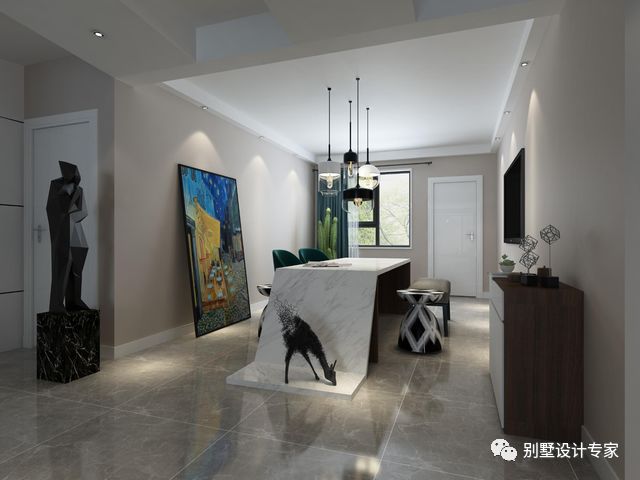 餐厅处设计行云流水般展示着低调与优雅。爵士白的背景强调着一份温馨与舒柔,配搭不同灰度值的家居,沉静色彩的铺展使得空间充斥着一种随性不羁的意味。而恰到好处的灯饰器具与挑高处挂画的对视,更是将这种洒脱不羁推向极致。