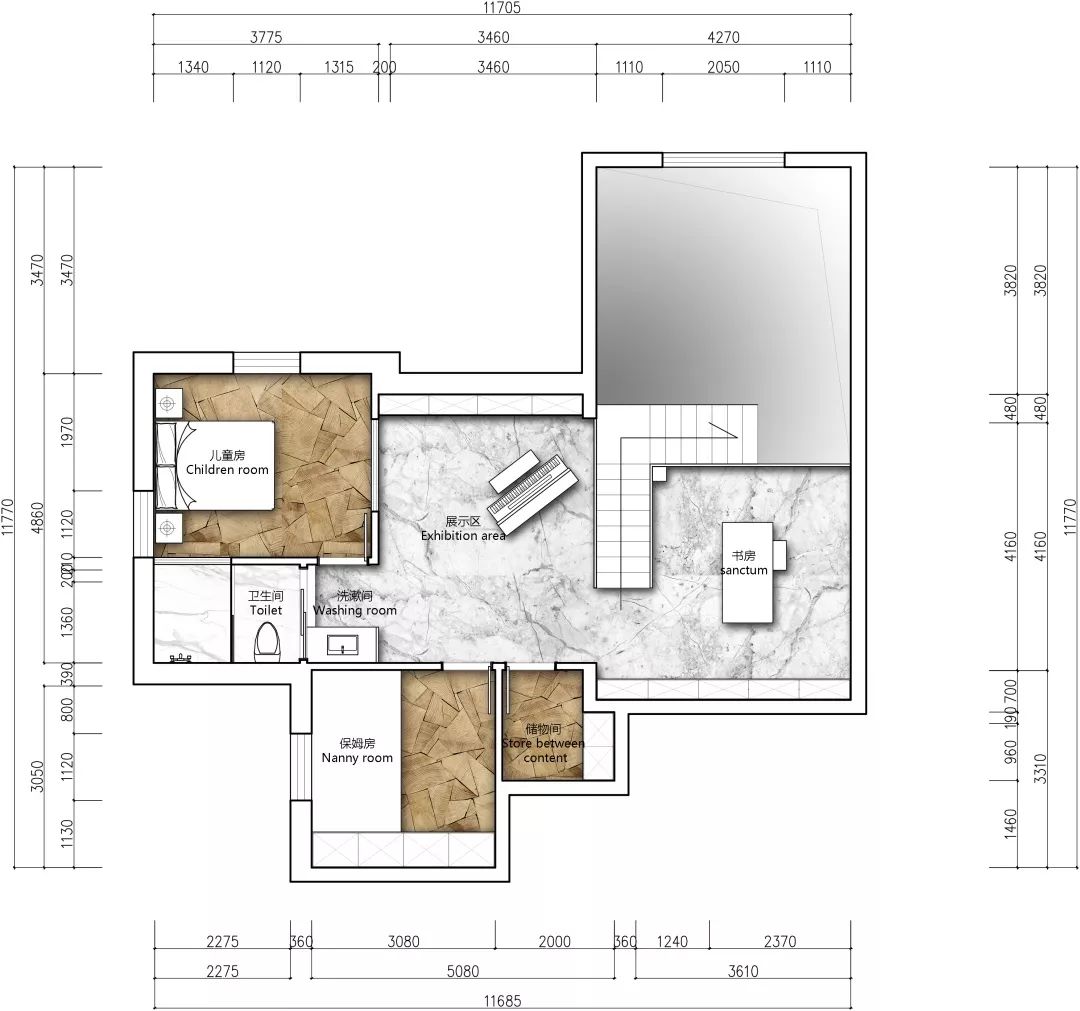 这是一个顶层复式,一楼的房高过高而二楼的房高又过矮,上楼的踏步比正常要多上几个,上楼还容易撞到头,因而楼梯的设计是一个很大的难点。