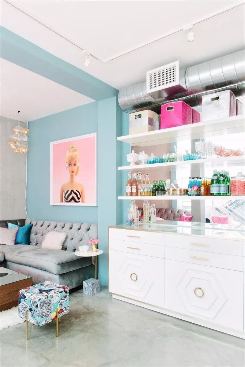 一改工业风清冷、硬阔的灰黑色调,以柔和恬静的浅松石色代替单一冷酷的灰色墙壁成为了案例设计的整体基调。粉色系列装饰和家具的迎合则为空间换上一种少女感,可爱俏皮的内饰陈列传递出鲜活热力。会客、餐厅,以及卧室的安排采取了开放的布置形式,一体化设计使空间之间形成整体感。
