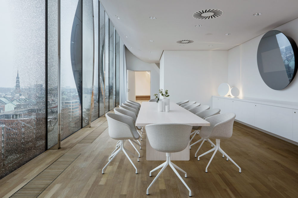 Herzog - de Meuron's concert hall furnished with minimalist white furniture