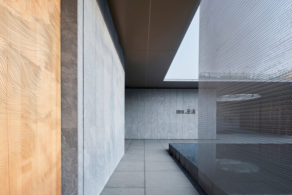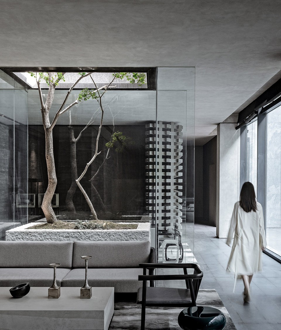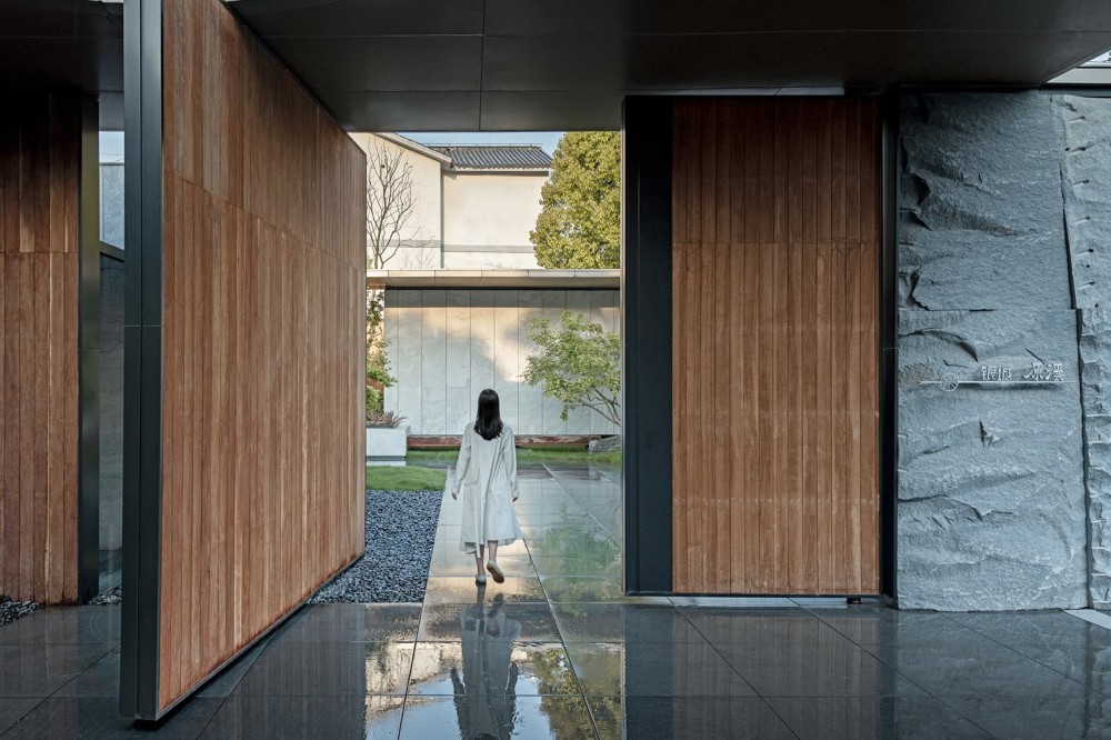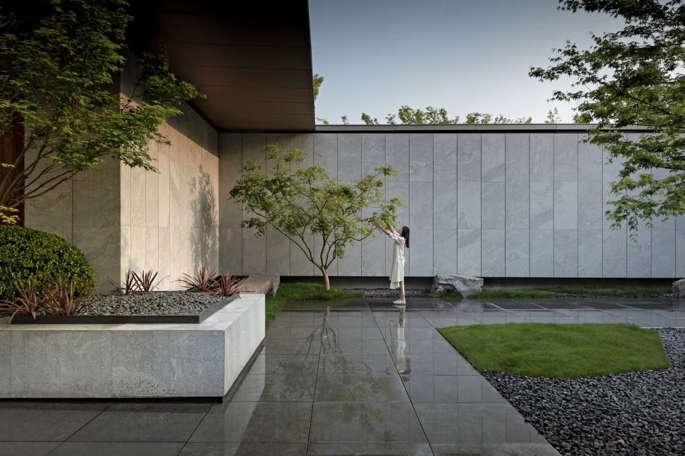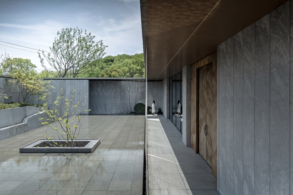 苏州园林艺术是古人的生活智慧和哲学,我们一直尝试通过设计实践来理解和探索古典园林的精神和技法。而随于时代,自然山水意境中的清新、优雅与闲适更是纷繁城市中的归真返璞。结合当代人的生活,我们认为这种东方哲学应于“境”而非于“形”,更需要研究的是适应现代人生活的空间体验而不拘泥于传统造园手法的复刻。 原溪庭院位于苏州姑苏区,距离“留园”1公里。不到1万平方米用地范围周边古树参天,弥漫着浓浓的历史文化名城和生活氛围。庭院由入口、停车场、建筑上下水院和内庭空间组成。建筑是未来的社区活动中心,对外开放,也是走进住区的入口场所。 “委曲松篁迳,清新锦绣篇。蟠胸有丘壑,随处是林泉”,江南园林中的诗画意境并非仅为表现生活的享受,更重要是在生活栖息的空间传达人追寻自然、感知自然的情感和价值观念。考虑到设计场地独特的地域文化属性,并结合使用功能,在设计理念上,每一个庭院都围绕着“自然”主题展开东方意境的体验和思考。而在尺度不大的用地范围内,建筑、室内和景观尝试了更好的协同与因借。 “空林”是走进入口内的第一个水庭院。中心静谧的水面、建筑和三面连廊交相辉映,水面映射着建筑背后的树林、泠冽的山石之墙还有天空。庭院的空间在此处是内向而留白的,但它似乎又满载着所有的景物,并分隔了墙外的喧嚣,恬静而悠然。一丛小树破水而出,在这里产生了独特的感染力,展现着无尽的生命气息。它和西侧自然的山石墙窜接了上下层的空间。建筑、室内和庭院在此相互交融,彼此空间共享。内与外、虚与实、刚与柔,我们希望使用者在此能够感受到一种在传统园林建筑中类似的有趣体验。 从水庭穿过旋转木门就来到树的庭院。与极简的水庭院不同,树庭院内柔软的植物、起伏的地形、丰富而精致的地被和厚重的置石成为基调,空间充满着清新自然的气息。走进树的庭院,这里是住区生活的场所。人的活动应该是多样和可选择的,我们强调空间氛围的体验而非点对点的纯视觉画面。斑驳的树影下,绿意盎然的自然之美才是住区生活的开始。