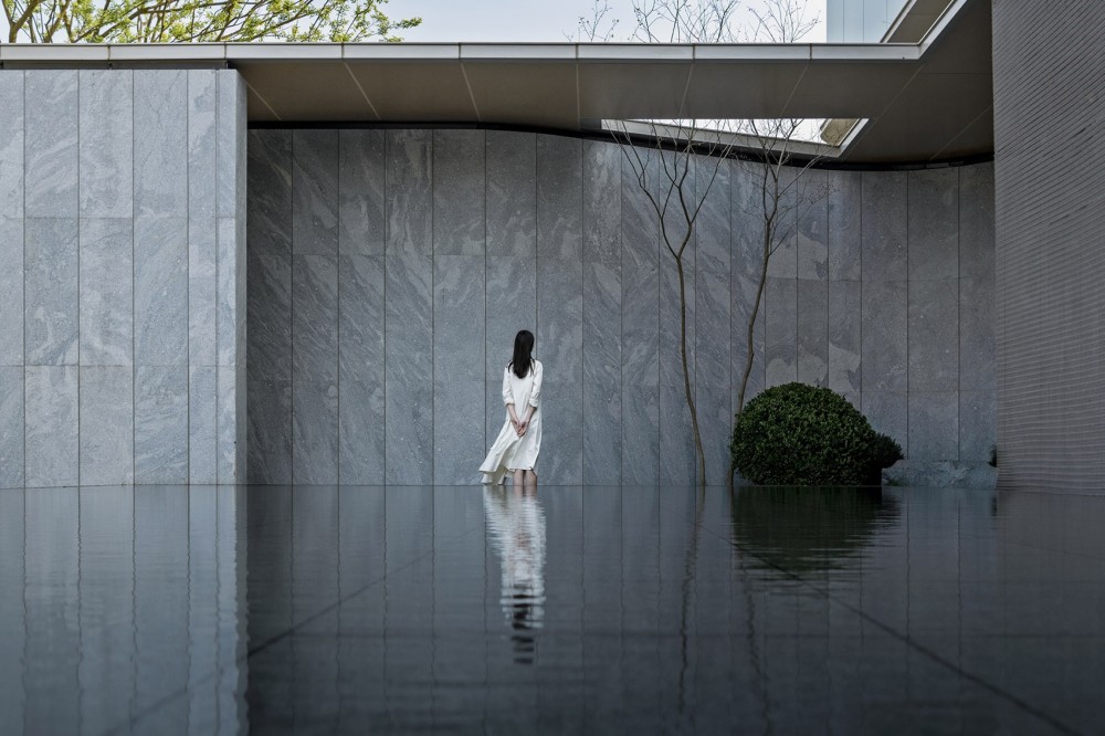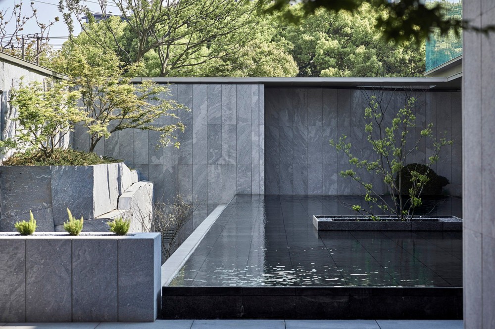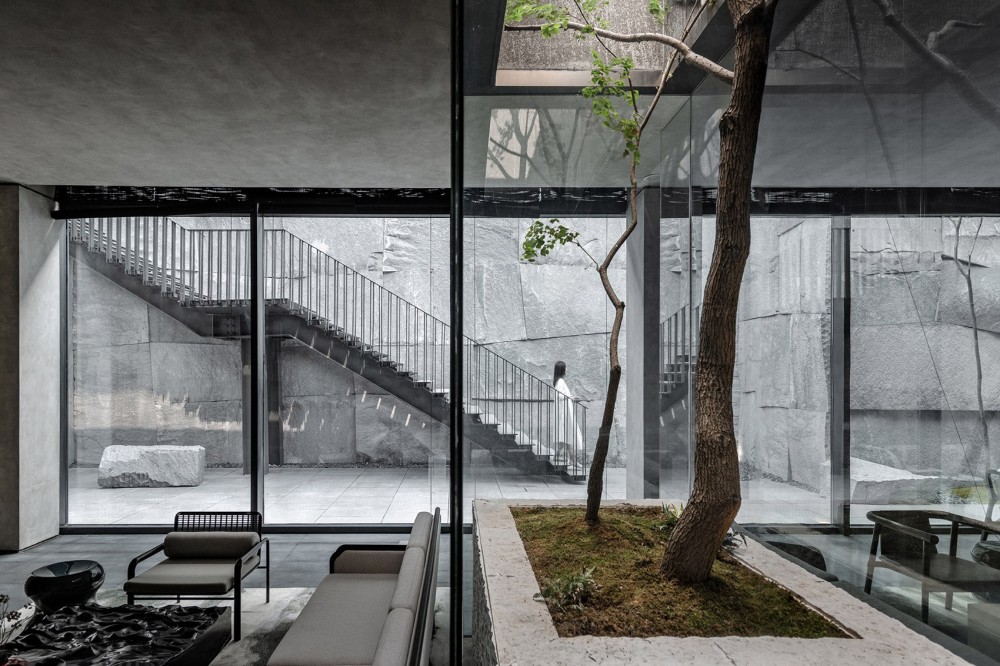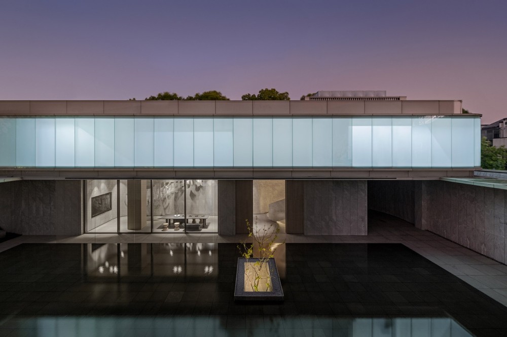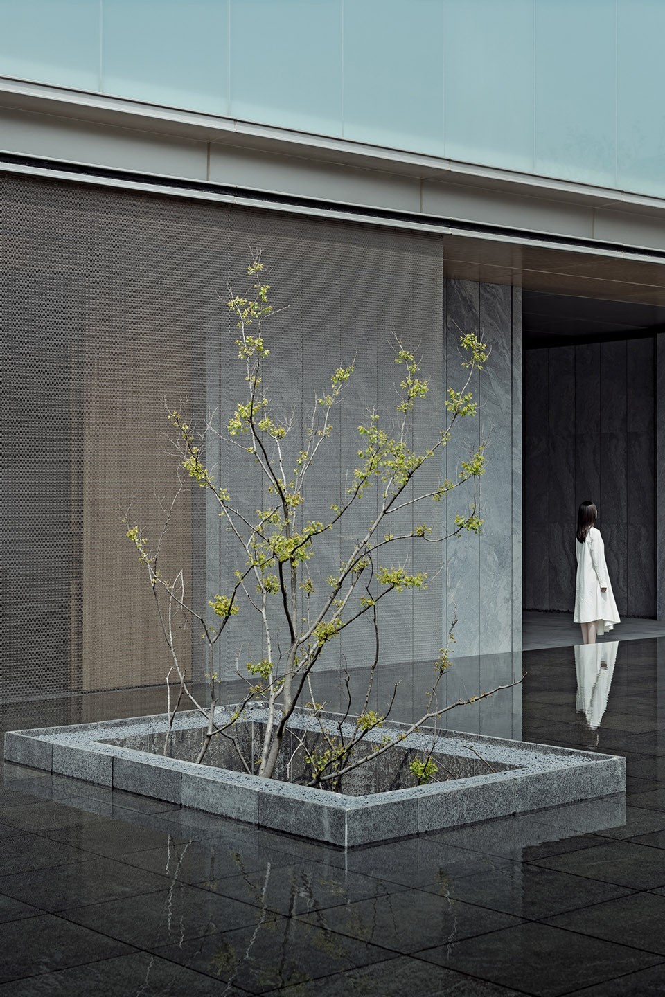 苏州园林艺术是古人的生活智慧和哲学,我们一直尝试通过设计实践来理解和探索古典园林的精神和技法。而随于时代,自然山水意境中的清新、优雅与闲适更是纷繁城市中的归真返璞。结合当代人的生活,我们认为这种东方哲学应于“境”而非于“形”,更需要研究的是适应现代人生活的空间体验而不拘泥于传统造园手法的复刻。 原溪庭院位于苏州姑苏区,距离“留园”1公里。不到1万平方米用地范围周边古树参天,弥漫着浓浓的历史文化名城和生活氛围。庭院由入口、停车场、建筑上下水院和内庭空间组成。建筑是未来的社区活动中心,对外开放,也是走进住区的入口场所。 “委曲松篁迳,清新锦绣篇。蟠胸有丘壑,随处是林泉”,江南园林中的诗画意境并非仅为表现生活的享受,更重要是在生活栖息的空间传达人追寻自然、感知自然的情感和价值观念。考虑到设计场地独特的地域文化属性,并结合使用功能,在设计理念上,每一个庭院都围绕着“自然”主题展开东方意境的体验和思考。而在尺度不大的用地范围内,建筑、室内和景观尝试了更好的协同与因借。 “空林”是走进入口内的第一个水庭院。中心静谧的水面、建筑和三面连廊交相辉映,水面映射着建筑背后的树林、泠冽的山石之墙还有天空。庭院的空间在此处是内向而留白的,但它似乎又满载着所有的景物,并分隔了墙外的喧嚣,恬静而悠然。一丛小树破水而出,在这里产生了独特的感染力,展现着无尽的生命气息。它和西侧自然的山石墙窜接了上下层的空间。建筑、室内和庭院在此相互交融,彼此空间共享。内与外、虚与实、刚与柔,我们希望使用者在此能够感受到一种在传统园林建筑中类似的有趣体验。 从水庭穿过旋转木门就来到树的庭院。与极简的水庭院不同,树庭院内柔软的植物、起伏的地形、丰富而精致的地被和厚重的置石成为基调,空间充满着清新自然的气息。走进树的庭院,这里是住区生活的场所。人的活动应该是多样和可选择的,我们强调空间氛围的体验而非点对点的纯视觉画面。斑驳的树影下,绿意盎然的自然之美才是住区生活的开始。