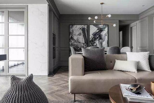 餐廳配色清爽明亮,定制的大理石餐桌搭配金属元素,黄铜艺术吊灯,让素雅的空间增加了现代艺术气息,墙面悬挂着两幅抽象画,丰富了这个灰色空间的视觉效果,再加精致的人字形的地板铺设,营造出优雅大气且带着淡淡复古气息的空间氛围。