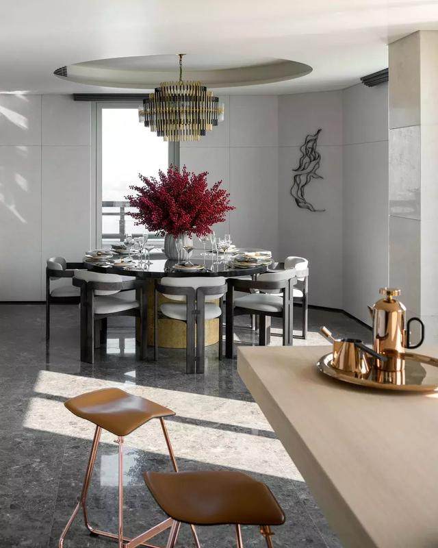 [江水漾西风,江花脱晚红。]朝南的江景餐廳与客廳、西厨及中厨相连通。在享受美食的同时,窗外的奢华尽收眼底。圆形餐桌带来的浑厚、黑金色带来的强烈视觉观感与向经典致敬的Gallotti&Radice餐椅营造的俊朗气质的搭配,融汇东西方文化。